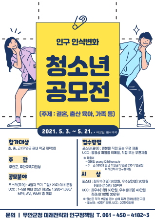 (무안=미래일보) 이중래 기자 = 전남 무안군(군수 김산)은 미래세대를 이끌어갈 청소년들에게 인구 문제에 대한 심각성을 알리고 사회적 공감대를 형성하고자 인구 인식변화 청소년 공모전을 개최한다고 밝혔다.